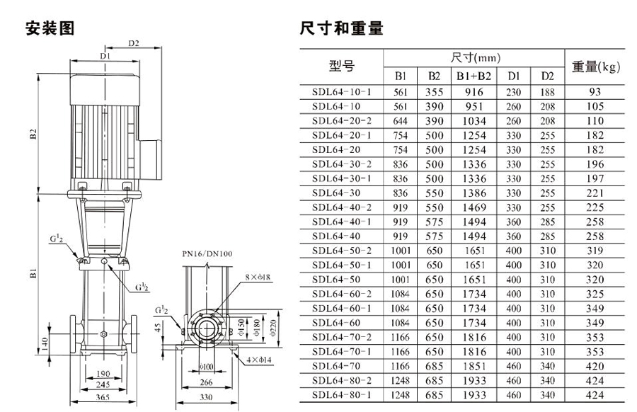 SDL64/SDLT64為配用標(biāo)準(zhǔn)電機(jī)的非自吸立式多級(jí)離心泵,電機(jī)軸和泵軸用聯(lián)軸器直接聯(lián)接,把拉桿用螺母將外筒,過流部件固定在支架和進(jìn)出水體之間,泵進(jìn)出水口在泵底部的同一直線上。泵可根據(jù)需要配置智能保護(hù)器,對(duì)泵的干轉(zhuǎn)、缺相、過載等進(jìn)行有效的保護(hù)。