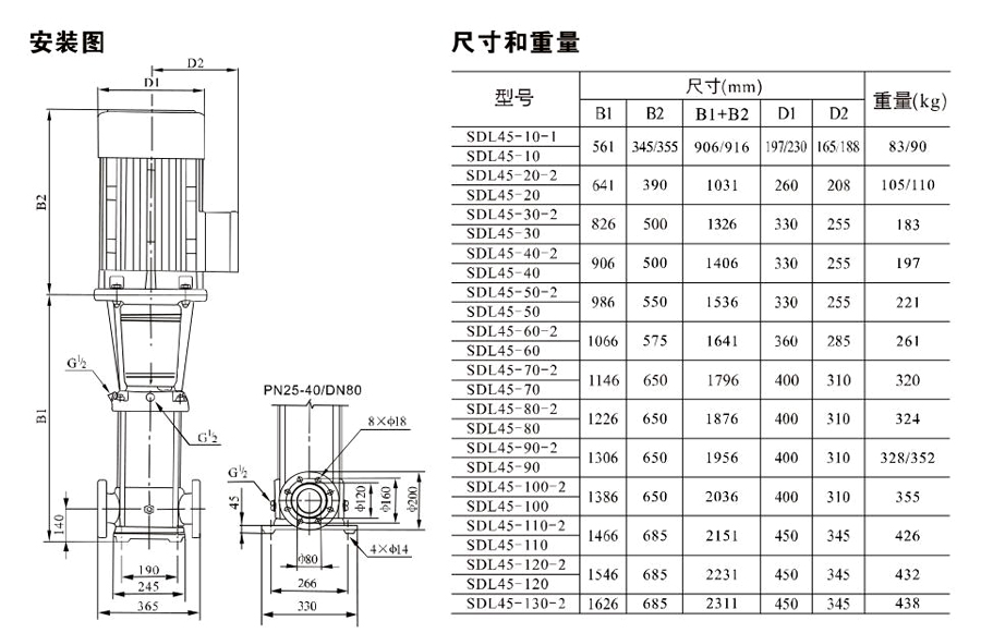 SDL45/SDLT45立式多級(jí)離心泵其管道式結(jié)構(gòu)可以確保泵可直接安裝在進(jìn)出在同一水平線上且管徑相同的水平管路系統(tǒng)中,這種設(shè)計(jì)使泵的結(jié)構(gòu)和管路更為緊湊。